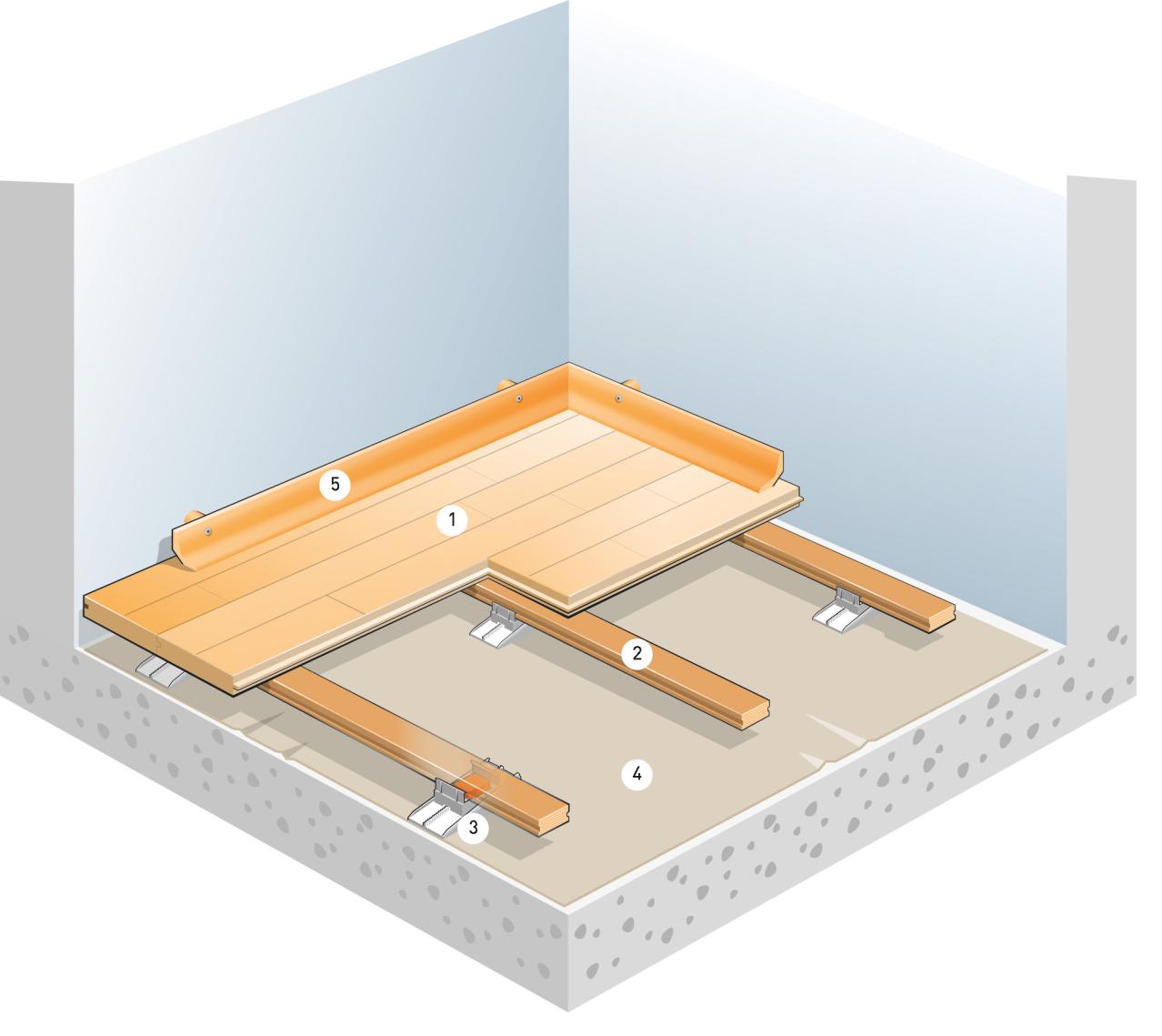 The wedge and shock pad are manufactured as a single component, making them quick and easy to fit. The system can be adjusted within a height range of 78 mm to 205 mm including the Junckers 22 mm thick floorboard.