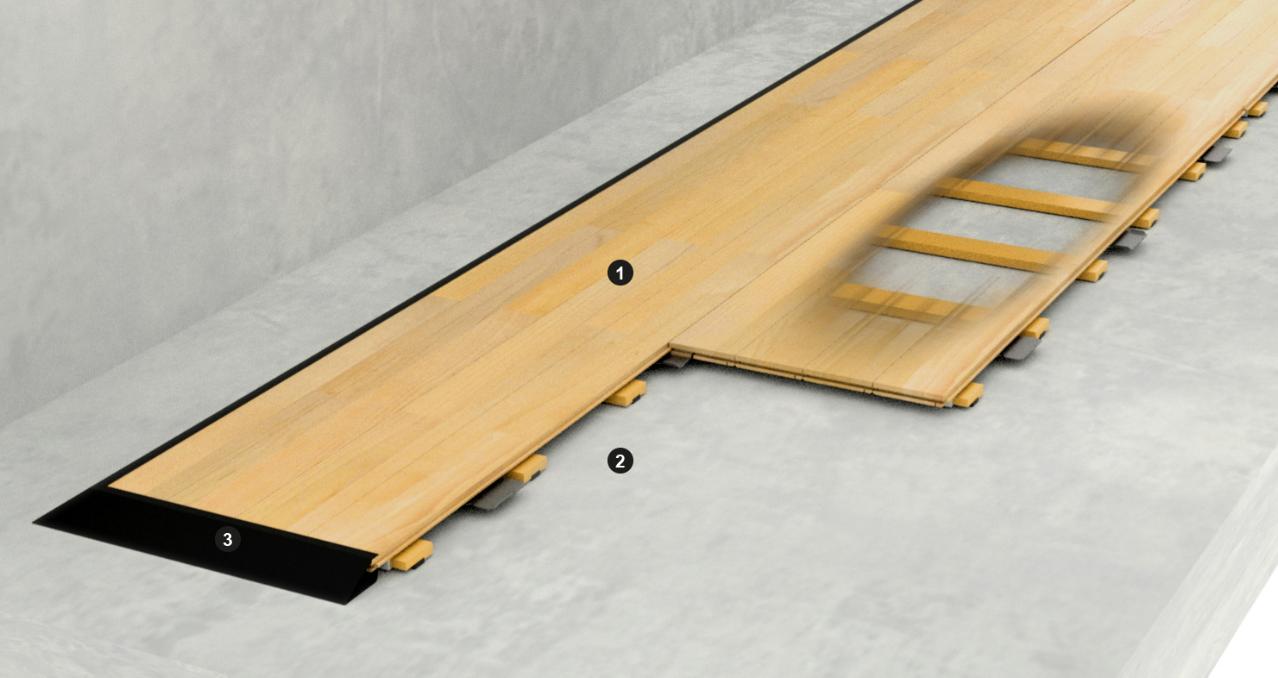Underneath each floor panel several prefixed birch battens are mounted together with a soft polyurethane foam to provide correct shock absorption and resilience. Increased panel stability with reinforced aluminum edges. The floor panels are easily locked into position by means of pre-mounted metal brackets.