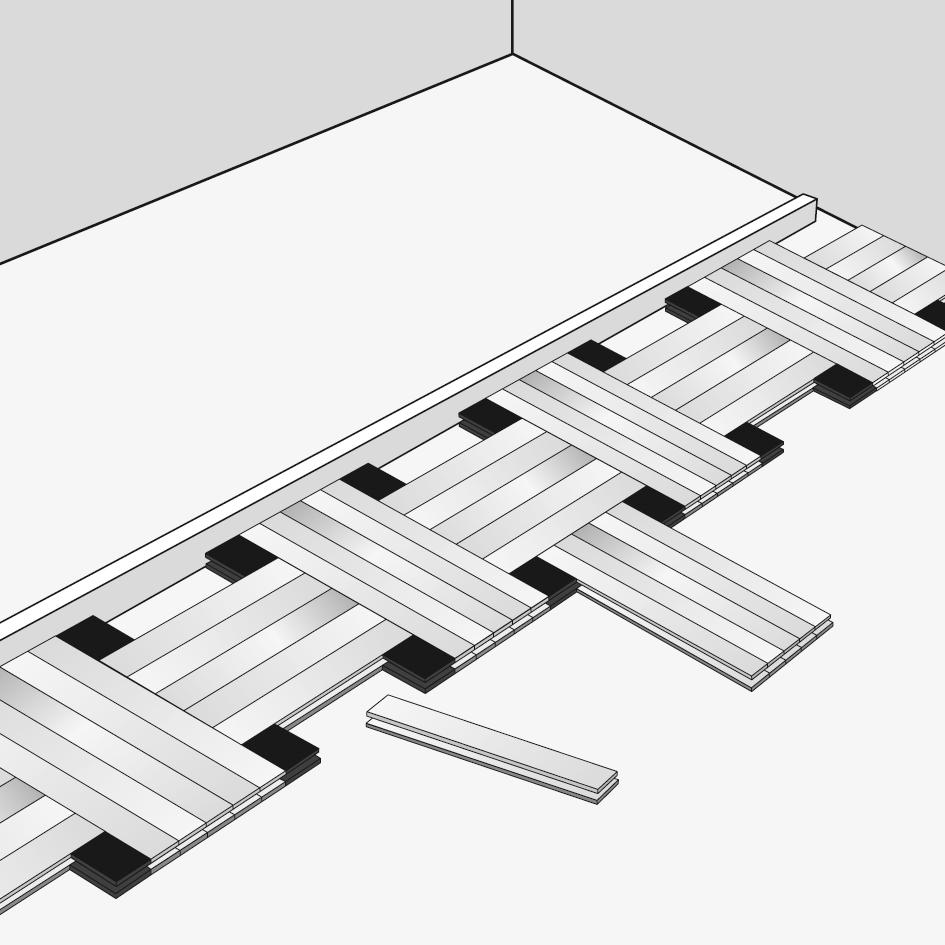 The staves should be laid so that their longitudinal direction is perpendicular to the existing floor boards. In order to achieve the correct surface tolerance, the subfloor can be levelled by planing, filling or by fixing minimum 15 mm (5/8'') thick plywood to the base. If plywood is used, the original laying direction can be used. It is important that the existing wooden floor has been properly fixed without loose boards or protruding fastenings.