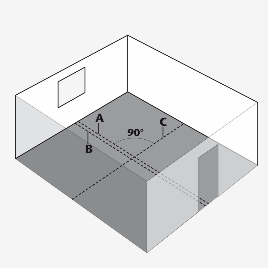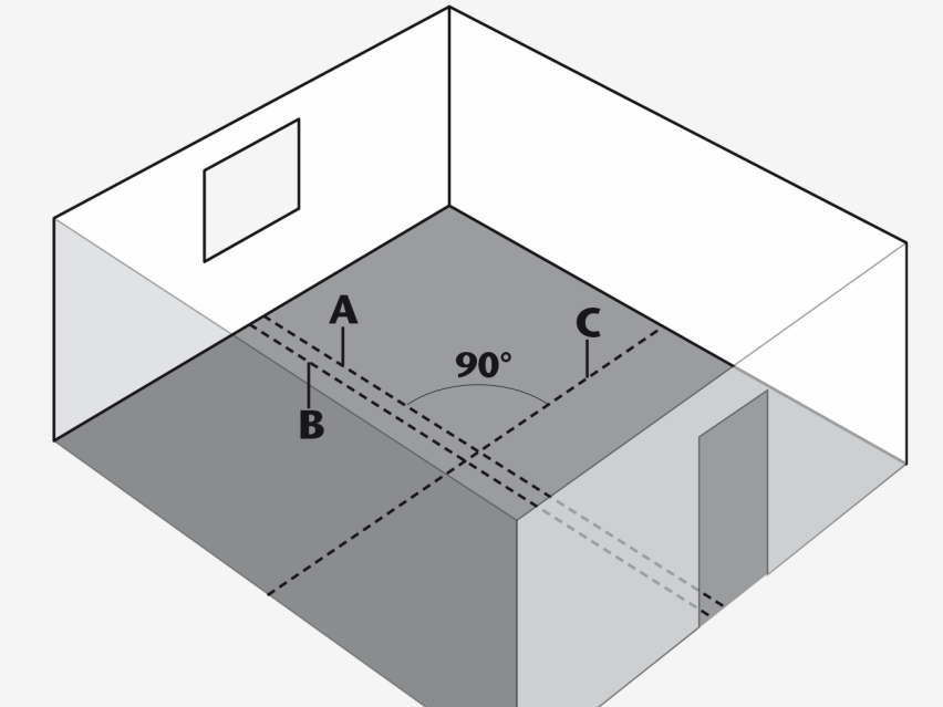 The two centre lines in the room (lines A and C) are marked by a chalk line or string at an angle of 90° to each other.