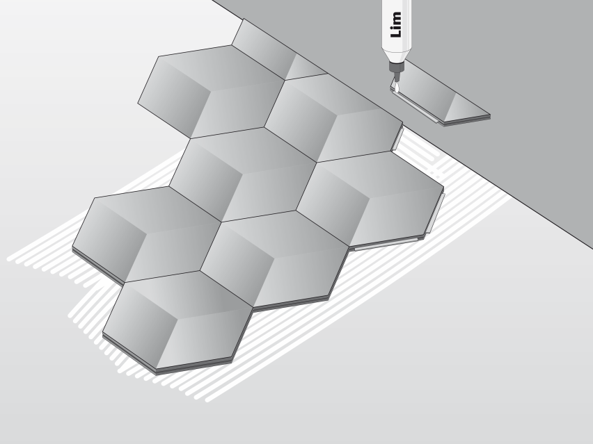 Hexparket wood tiles must NOT be glued in tongue and groove. However, wood tiles which can´t be securely fastened may occasionally be glued in the heading joints at walls and in the tongue and groove at the last row of wood tiles at the wall.