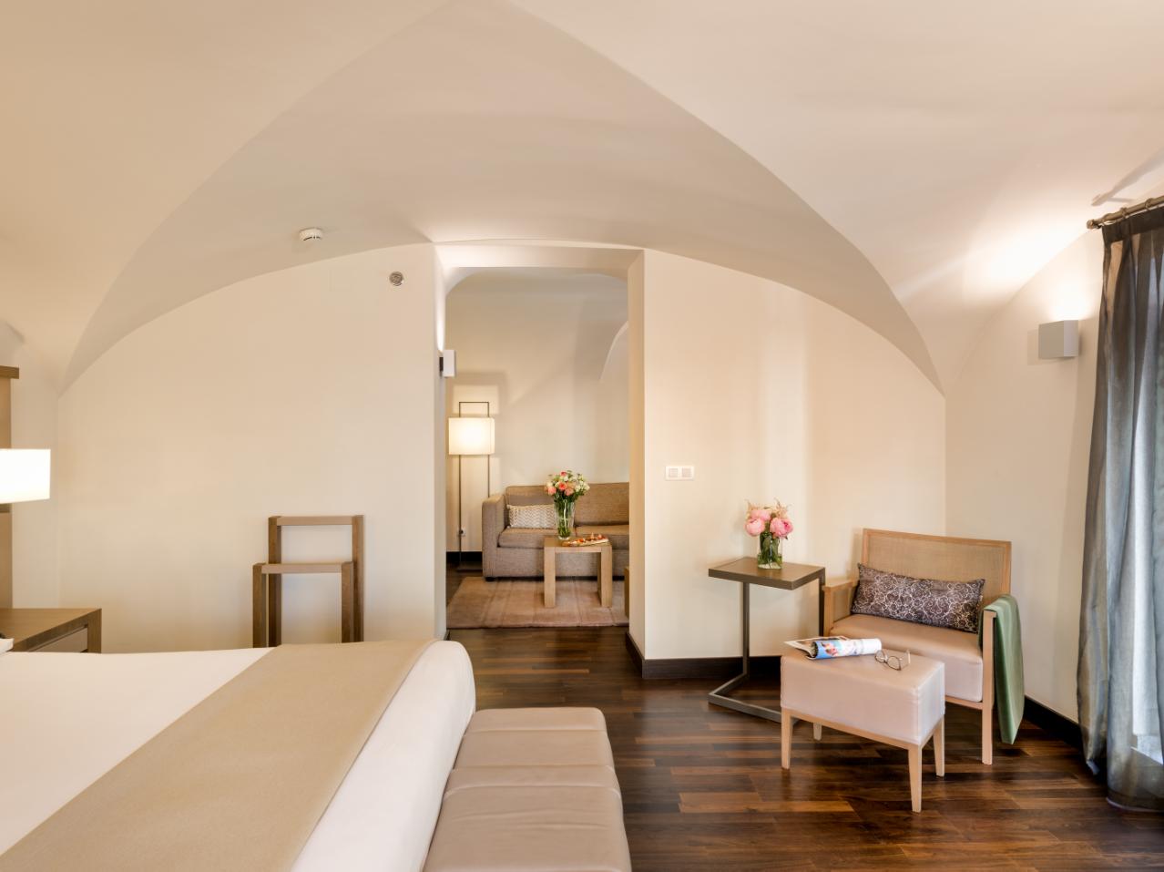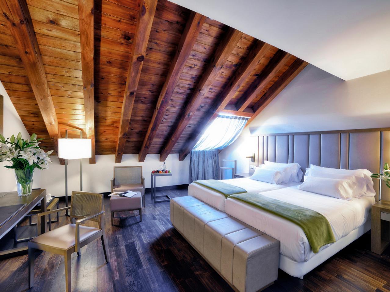 Ramón Esteve Architects made the most of the building’s neoclassical architecture and history to carefully restored the former palace into a luxurious hotel. Vaulted ceilings and original balconies were brought back to their former glory and incorporated into the sleek, contemporary rooms and social spaces. Warm tones of caramel, taupe and ivory with layers of texture added through soft furnishings and fabrics are perfectly complemented by a rich, dark solid wood floor – Junckers Black Oak Harmony.