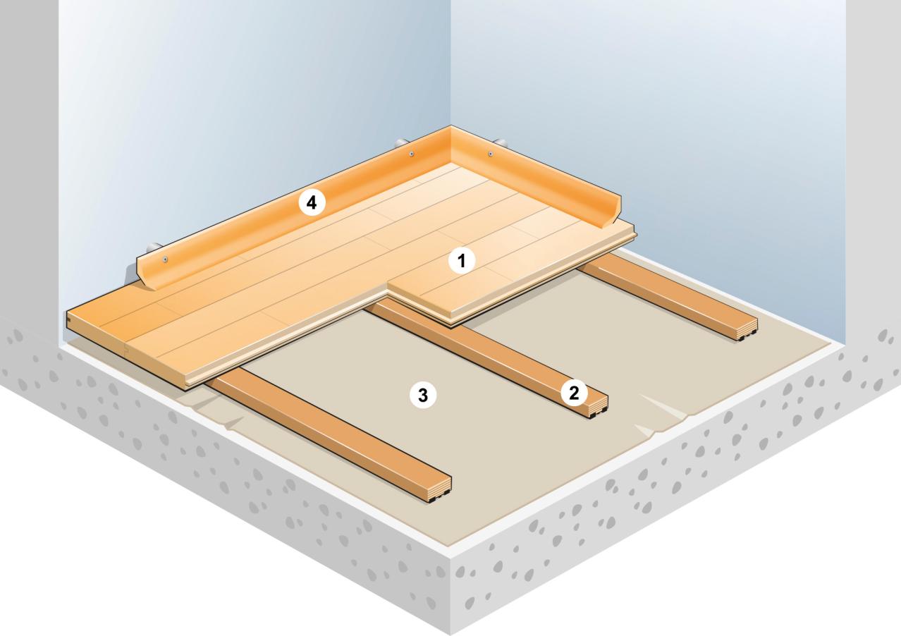 The solid floor boards are nailed to a resilient subconstruction of one layer engineered battens featuring a unique arrangement of specially developed rubber strips premounted on the underside of the battens.